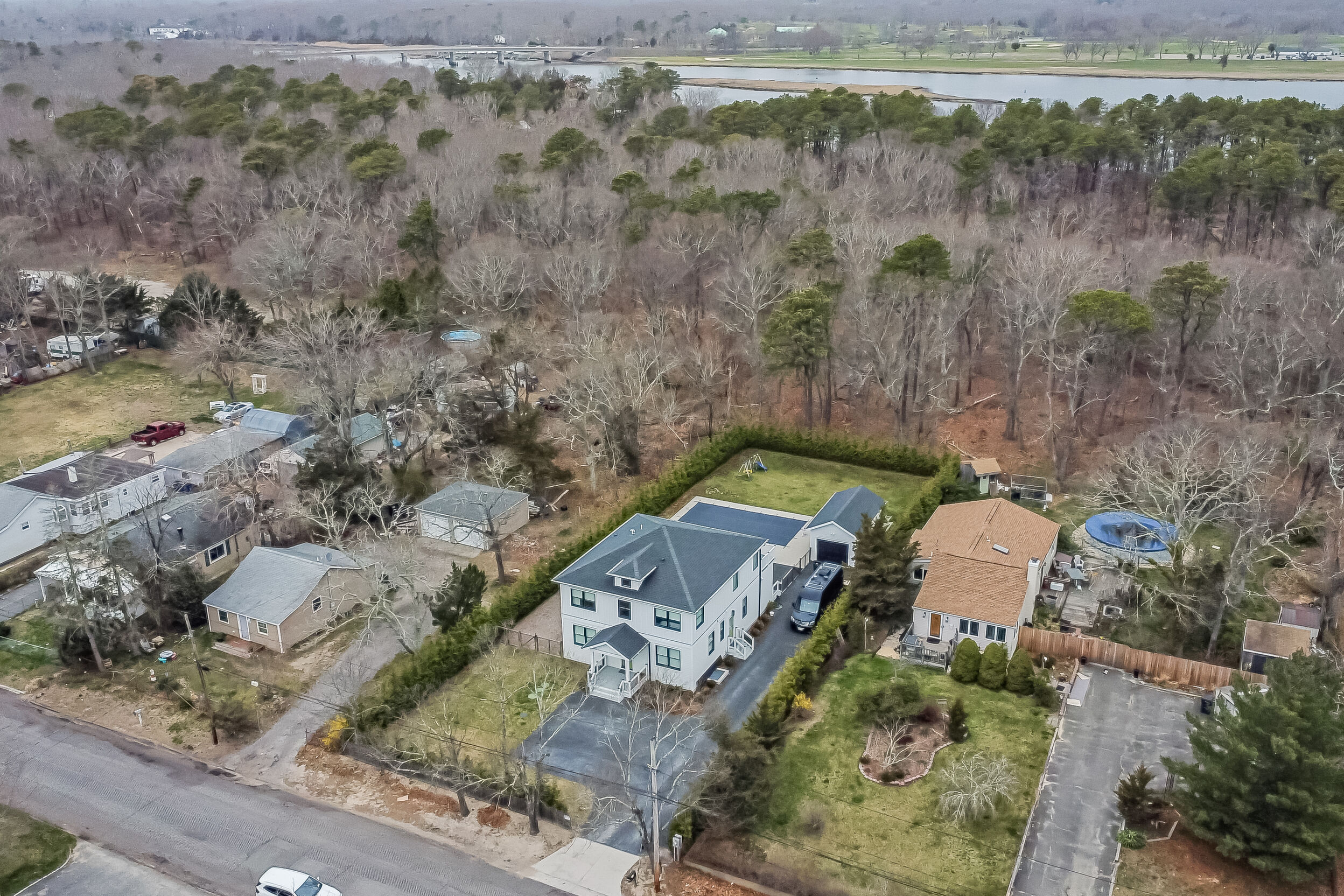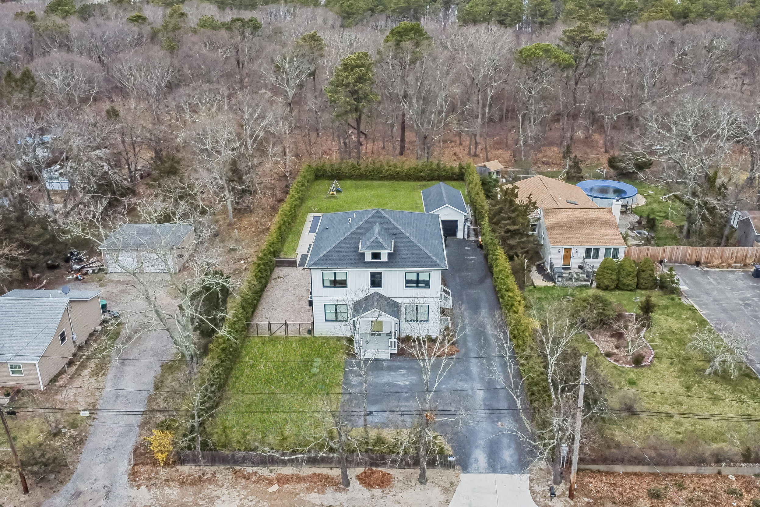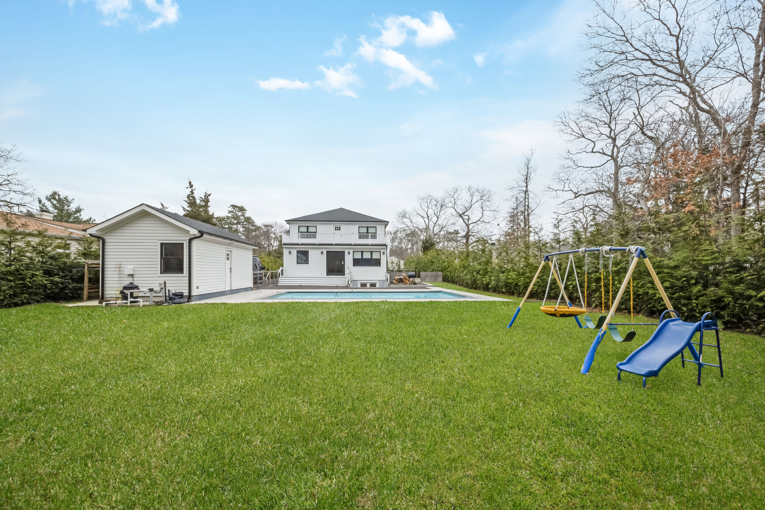 Welcome!! to This stunning Custom-build Contemporary style home, completed in 2023, Located on a beautifully landscaped property with more than 200 hand-planted privacy trees, that currently measure 20 feet in height, this architecturally designed home features 5 spacious bedrooms, 4,5 baths, a spacious open-concept layout connects the gourmet kitchen to the living areas, solid wood abundant kitchen cabinet with cambria Quartz countertops and backsplash, premium stainless-steel appliances, with 6" wide-plank white-stained oak hardwood floors, 3/5" R-15 Interior and exterior sound proof foam., 10" fiberglass insulation , baseman walls with cement 4,500 PCI insulation. A full-width balcony on the second floor, offering a view of the pool. Andersen 400 Series windows and doors, and Venetian plaster walls accenting the stairway to the finished basement-complete with 12-foot-wide entry, and 10 food Hight, wet bar, Ample space for recreation, or playroom, The master suite has its own bathroom, with marble floors with radiant heating. exterior, surrounded by premium pavers 18' x 32' in-ground vinyl pool, framed. A detached garage adds functionality, dual 200 AMP electric panels, HVAC Heating and cooling, (natural gas hot air furnace and air conditioning system) instant hot Watter tank. Hydro septic system, sprinkles back and front, locates 20 minutes from Southampton's. Don't miss this opportunity.